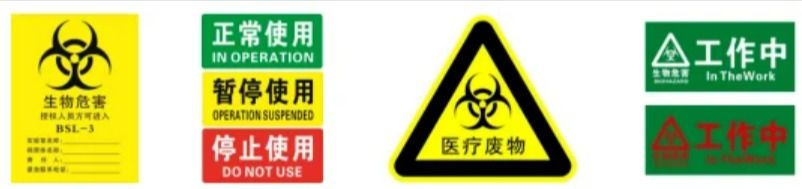 ● 专用标识是指主要设置在实验室主入口门上、医废处置场所及仪器设备上,用来标注或者提示实验室安全等级、实验室或设备使用状态的专用图形标识。如下图: