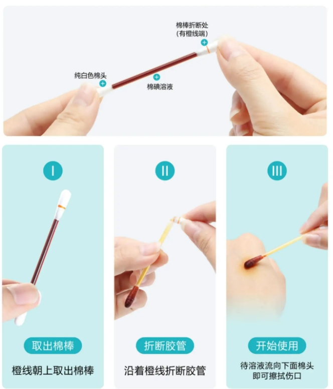 ①一次性碘伏消毒棉棒:适用于皮肤较小的破损、擦伤、割伤、烫伤等浅层皮肤创面的消毒杀菌。